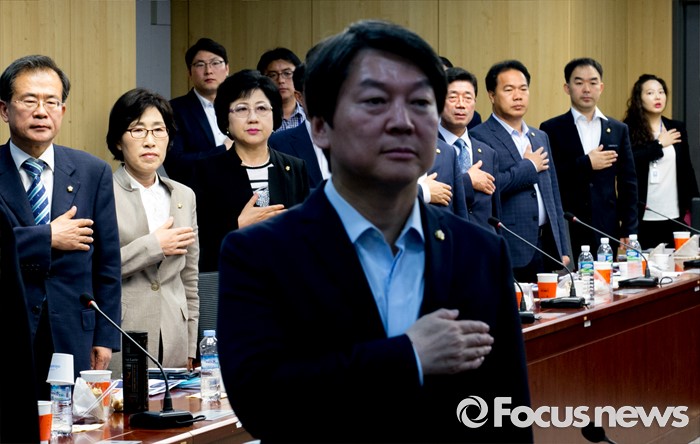 (서울=포커스뉴스) 29일 오전 서울 여의도 국회 의원회관에서 열린 국민의당 정책역량강화 워크숍에 참석한 안철수 상임공동대표와 의원들이 국기에 대한 경례를 하고 있다.