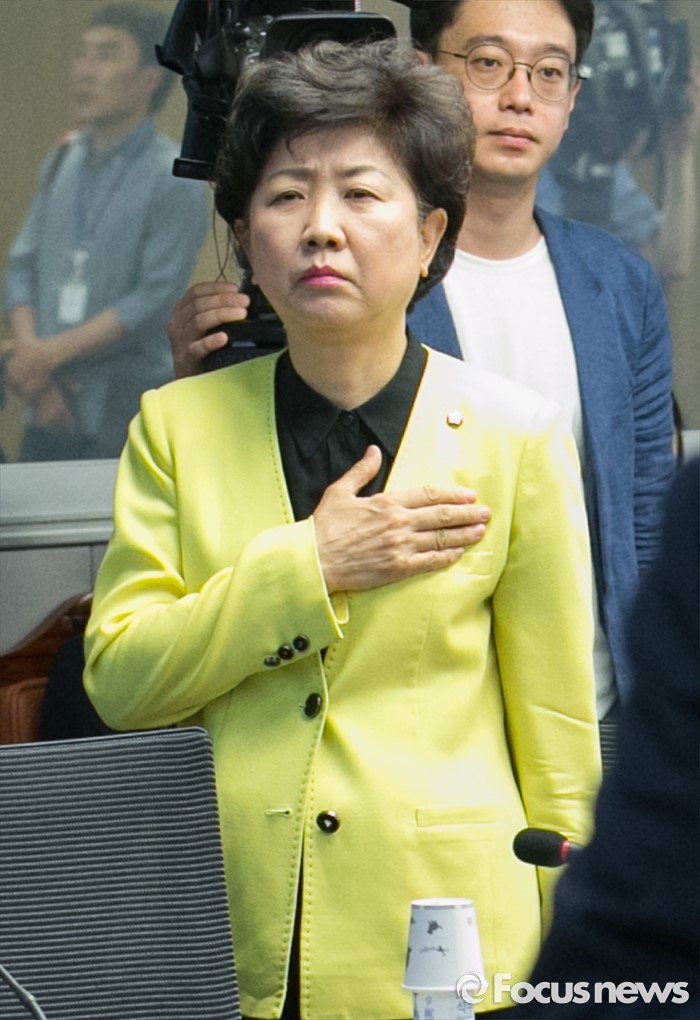 (서울=포커스뉴스) 29일 오전 서울 여의도 국회 의원회관에서 열린 아젠다 2050 창립총회에 참석한 박인숙 새누리당 의원이 국기에 대한 경례를 하고 있다.