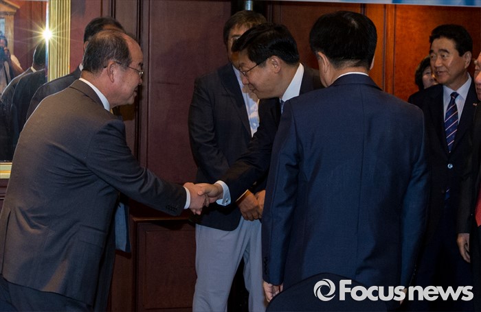 (서울=포커스뉴스) 29일 오전 서울 강남구 그랜드 인터콘티넨탈 호텔에서 열린 산업부 주최 조선업계 CEO ·전문가 간담회에 참석한 주형환(오른쪽) 산업통상자원부 장관과정성립 대우조선해양 사장이 악수하고 있다.