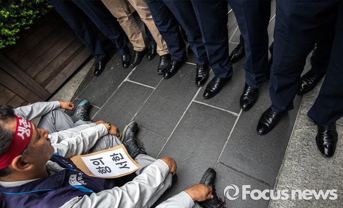 (서울=포커스뉴스) 29일 오전 서울 서초구 삼성 사옥 앞에서 삼성중공업 노동협의회 관계자들이 구조조정에 반대하는 항의서한을 삼성 측에 전달하기 위해 삼성의 보안요원들과 대치하고 있다. 삼성중공업은 지난 15일 임원들의 임금 반납, 희망퇴직 등이 포함된 구조조정안을 공개했으며 올해 약 1500명 규모의 희망퇴직을 단행할 계획이라 밝혔다.