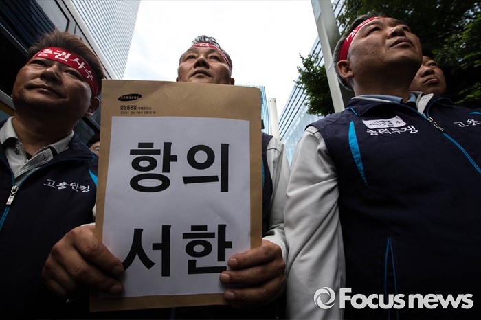 (서울=포커스뉴스) 29일 오전 서울 서초구 삼성 사옥 앞에서 삼성중공업 노동협의회 관계자들이 구조조정에 반대하는 항의서한을 삼성 측에 전달하기 위해 삼성의 보안요원들과 대치하고 있다. 삼성중공업은 지난 15일 임원들의 임금 반납, 희망퇴직 등이 포함된 구조조정안을 공개했으며 올해 약 1500명 규모의 희망퇴직을 단행할 계획이라 밝혔다.