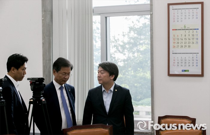 (서울=포커스뉴스) 29일 오전 서울 여의도 국회에서 열린 국민의당 최고위원회의에 참석한 안철수(오른쪽부터) 상임공동대표와 천정배 공동대표, 손금주 대변인이 대화하고 있다.