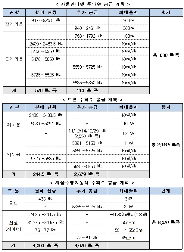 드론에는 2,679㎒폭 주파수를 신규·추가로 공급한다. 위성을 활용한 드론 제어용으로 2520㎒폭을 신규 공급한다. 영상전송(환경·화재감시용) 등 각종 드론 임무용을 위해 159㎒폭(소형 드론 100㎒폭, 중대형 드론 59㎒폭)을 추가로 제공한다.