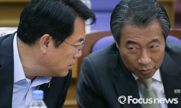 (서울=포커스뉴스) 29일 오전 서울 여의도 국회 의원회관에서 열린 새누리당 중앙위원회 혁신을 위한 대토론회에 참석한 정진석(왼쪽) 원내대표와 정종섭 의원이 대화하고 있다.