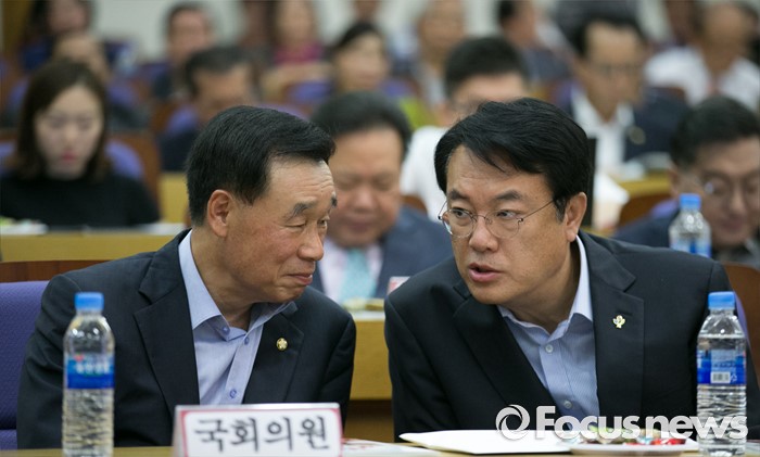 (서울=포커스뉴스) 29일 오전 서울 여의도 국회 의원회관에서 열린 새누리당 중앙위원회 혁신을 위한 대토론회에 참석한 정진석(오른쪽) 원내대표와 김기선 제1사무부총장이 대화하고 있다.