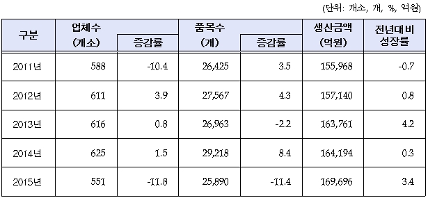 29일 식품의약품안전처(처장 손문기)가 발표한 ‘2015년 국내 의약품 생산, 수.출입 현황’에 따르면 작년 의약품 전체 생산실적은 16조9696억원으로 전년 대비 3.4% 증가했다.