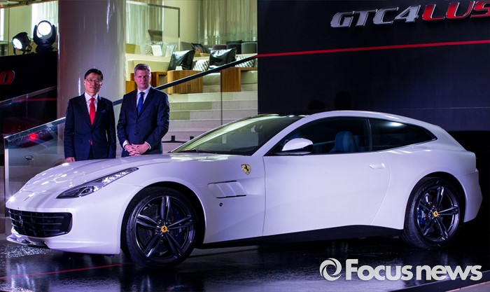(서울=포커스뉴스) 29일 오전 서울 광진구 W서울 워커힐 호텔에서 열린 '페라리 GTC4 루쏘(GTC4Lusso)' 언론 포토세션 행사에 참석한 디터 넥텔페라리 극동 및 중동지역 CEO와 김광철 FMK 대표이사가 신차를 소개하고 있다.