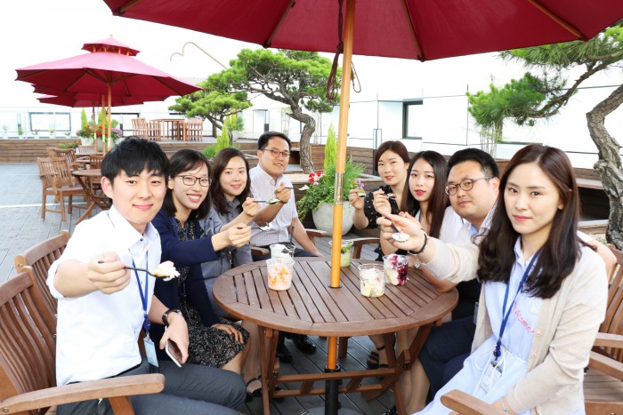 유진 관계자는 "여름휴가의 목적은 재충전이고 리프레쉬를 통해 사내분위기와 업무능률이 향상되는 등 긍정적인 효과가 크다"면서 "직원들이 가족과 함께 여행을 즐기고 휴식을 취할 수 있도록 휴가를 적극 장려할 계획"이라고 말했다.유진 직원들이 아이스크림을 먹으며 여름휴가에 대한 이야기를 나누고 있다.<사진제공=유진>