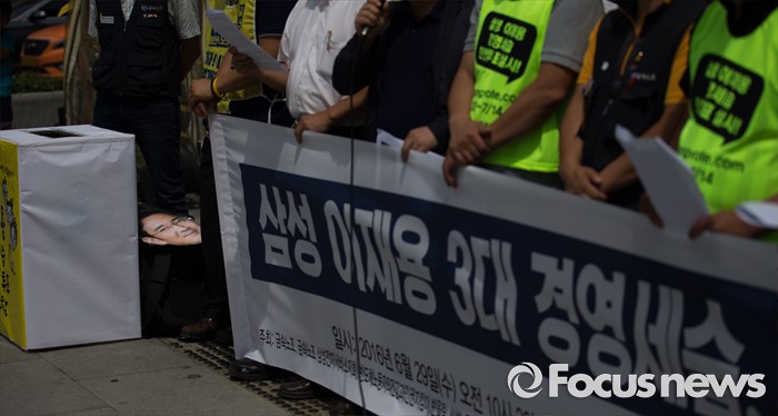 (서울=포커스뉴스) 29일 오전 서울 광화문광장에서 열린 '삼성 이재용 3대 세습, 이대로 괜찮은가?' 찬반투표 선포 기자회견 중 이재용 삼성전자 부회장의 가면이 바닥에 놓여 있다.