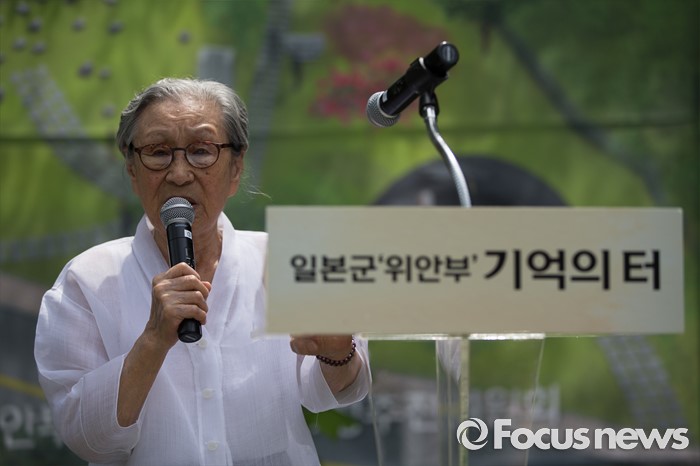 (서울=포커스뉴스) 29일 오전 서울 중구 예장동 옛 통감관저 터에서 열린 일본군 위안부 피해자 추모공원 '기억의 터' 기공식에 참석한 김복동 할머니가 기념사를 하고 있다.