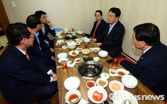 (서울=포커스뉴스) 정진석 새누리당 원내대표가 29일 오후 서울 여의도 한 음식점에서 열린 복당 의원들과의 오찬에 참석해 의원들과 인사하고 있다. 왼쪽부터 김도읍 원내수석부대표, 주호영, 장제원 의원, 박명재 사무총장, 정 원내대표, 안상수 의원.
