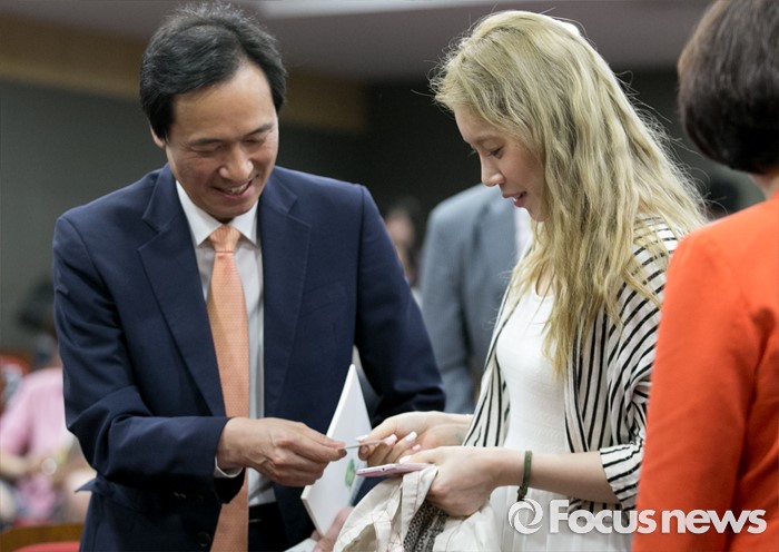 (서울=포커스뉴스) 29일 오후 서울 여의도 국회 의원회관에서 열린 동물복지포럼 출범식에 참석한 우상호(왼쪽) 더불어민주당 원내대표와 가수 배다해가 인사하고 있다.