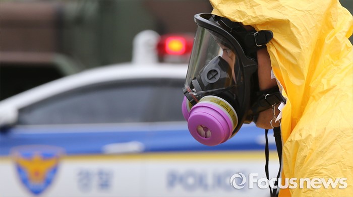 (세종=포커스뉴스) 29일 오후 세종시 정부세종청사경비대에서 열린 적 특수전부대원 침투 및 화학폭탄 폭발 대응 민·관·군·경 합동 민방위훈련에서 경찰들이 방호복을 입고 환자를 이송하고 있다.