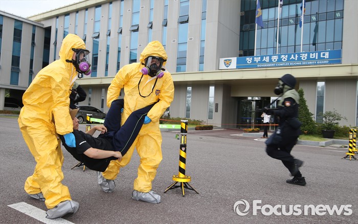 (세종=포커스뉴스) 29일 오후 세종시 정부세종청사경비대에서 열린 적 특수전부대원 침투 및 화학폭탄 폭발 대응 민·관·군·경 합동 민방위훈련에서 경찰들이 방호복을 입고 환자를 이송하고 있다.