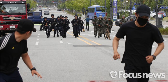 (세종=포커스뉴스) 29일 오후 세종시 정부세종청사경비대에서 열린 적 특수전부대원 침투 및 화학폭탄 폭발 대응 민·관·군·경 합동 민방위훈련에서 32시단 병력과 경력들이 테러범을 추적하고 있다.
