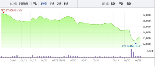 특히 검찰이 FNC엔터에 대해 압수수색을 실시했다는 소식이 알려진 23일(종가 1만3050원) 이후 주가는 급락했다. 27일에는 52주 최저가를 경신하며 1만2050원을 기록하기도 했다.