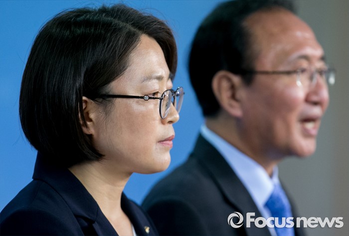 (서울=포커스뉴스) 29일 오후 서울 여의도 국회 정론관에서 미래창조과학방송통신위원회 재배정을 요구하며 농성에 들어갔던 추혜선(왼쪽) 정의당 의원과 노회찬 원내대표가 농성을 해제하고 외교통일위원회 배정을 받아들이는 내용의 기자회견을 하고 있다.