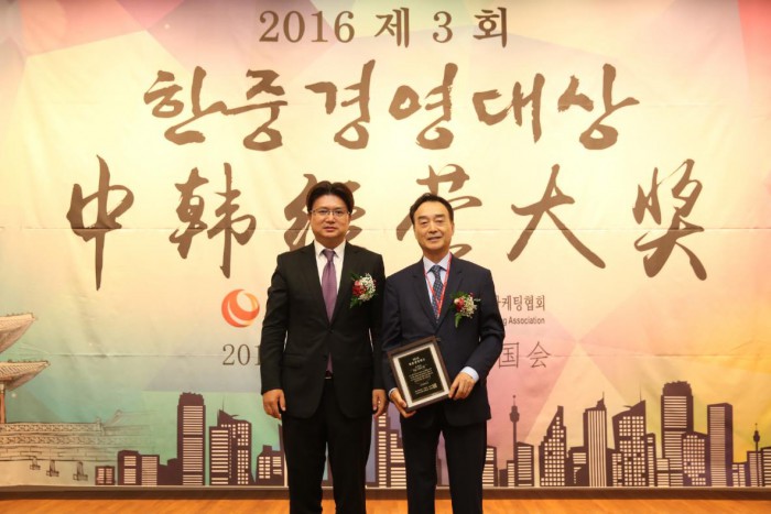 '한중경영대상'은 한국과 중국의 공동 산업발전을 위해 2013년 제정한 국제 시상제도로, 공유가치경영을 잘 실천하고 있는 기업과 개인에게 수여하는 상이다.