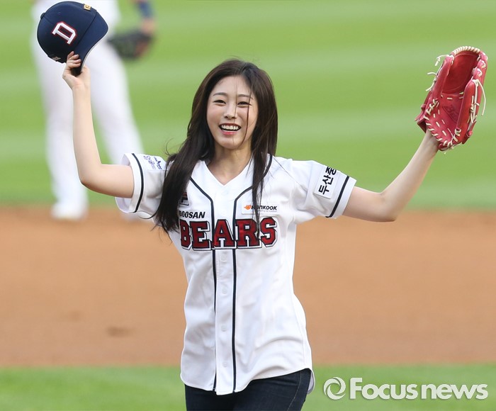 (서울=포커스뉴스) 29일 서울 잠실구장에서 열린 2016 프로야구 NC-두산 경기에서 걸그룹 '러블리즈'의 서지수가 성공적인 시구에 기뻐하고 있다.