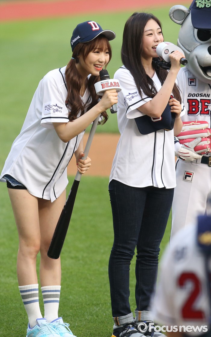 (서울=포커스뉴스) 29일 서울 잠실구장에서 열린 2016 프로야구 NC-두산 경기에서 걸그룹 '러블리즈'의 서지수(오른쪽)와 류수정이 시구, 시타 전에 관중에게 인사하고 있다.