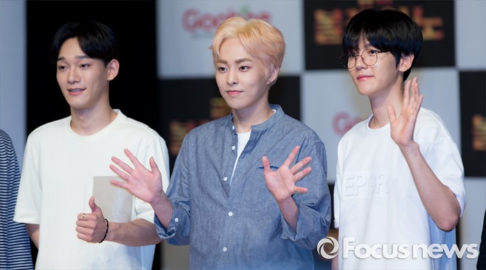 (서울=포커스뉴스) 29일 오후 서울 강남구 일지아트홀에서 열린 '굽네 볼케이노와 함께하는 엑소(EXO) 치밥 쿠킹 팬사인회'에서 첸(왼쪽부터), 시우민, 백현이 포즈를 취하고 있다.