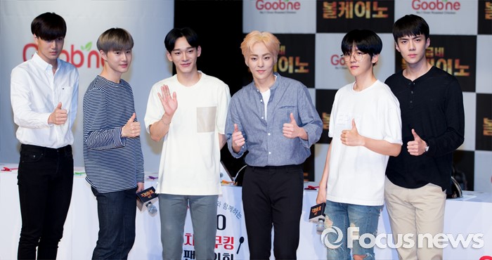 (서울=포커스뉴스) 29일 오후 서울 강남구 일지아트홀에서 열린 '굽네 볼케이노와 함께하는 엑소(EXO) 치밥 쿠킹 팬사인회'에서 카이(왼쪽부터), 수호, 첸, 시우민, 백현, 세훈이 포즈를 취하고 있다.