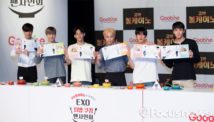 (서울=포커스뉴스) 29일 오후 서울 강남구 일지아트홀에서 열린 '굽네 볼케이노와 함께하는 엑소(EXO) 치밥 쿠킹 팬사인회'에서 카이(왼쪽부터), 수호, 첸, 시우민, 백현, 세훈이 포즈를 취하고 있다.