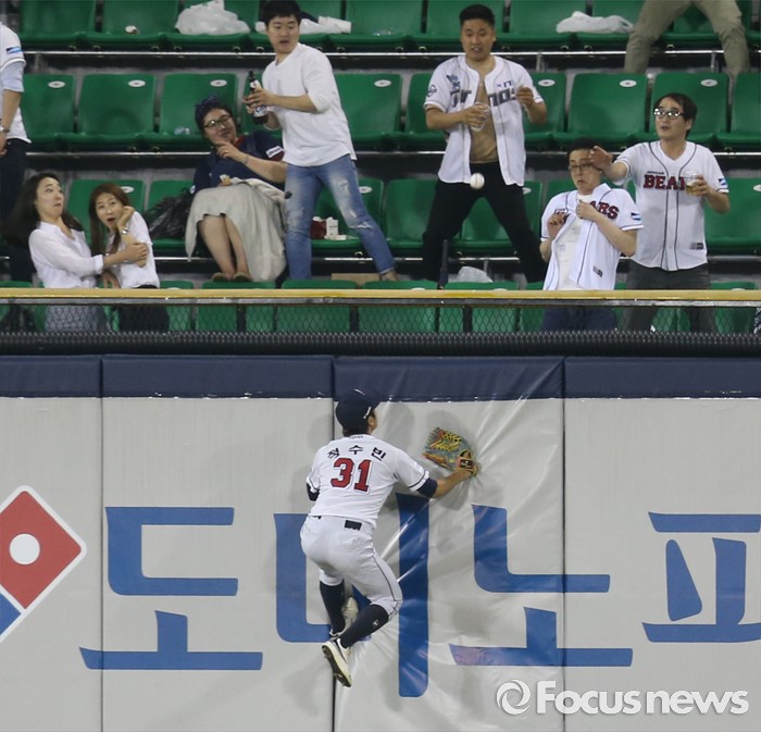 (서울=포커스뉴스) 29일 서울 잠실구장에서 열린 2016 프로야구 NC-두산 경기 6회초 1사후 두산 중견수 정수빈이 펜스를 타고 올라 NC 이호준의 홈런 타구를 바라보고 있다.