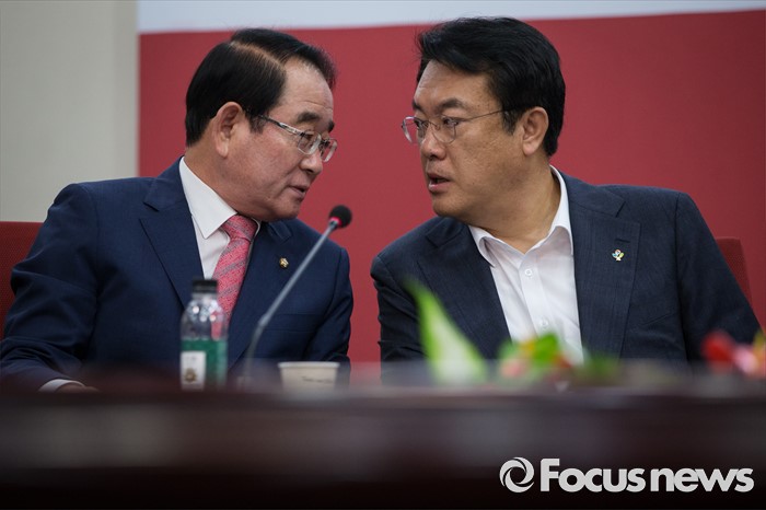 (서울=포커스뉴스) 정진석 새누리당 원내대표와 박명재 사무총장이 30일 오전 서울 여의도 당사에서 혁신비상대책위원회의를 하고 있다.