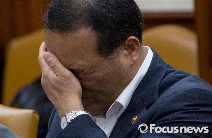 (서울=포커스뉴스) 30일 오전 서울 종로구 정부서울청사에서 열린 제2차 산업경쟁력 강화 관계장관회의에 참석한 홍윤식 행정자치부 장관이 얼굴을 만지고 있다.