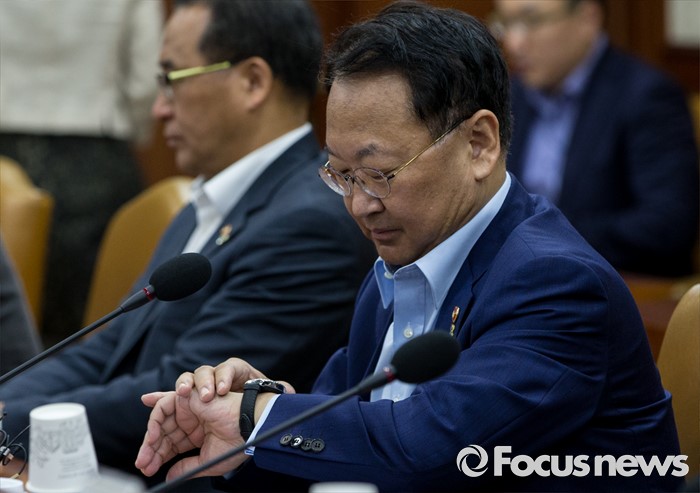 (서울=포커스뉴스) 30일 오전 서울 종로구 정부서울청사에서 열린 제2차 산업경쟁력 강화 관계장관회의에 참석한 유일호 부총리 겸 기획재정부 장관이 시계를 보고 있다.
