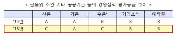 국책은행인 산업은행과 수출입은행은 C등급을 받았다. 2014년 산업은행은 A등급을 받았으나 두 단계 떨어졌으며 수출입은행은 B등급에서 한 계단 하락했다.