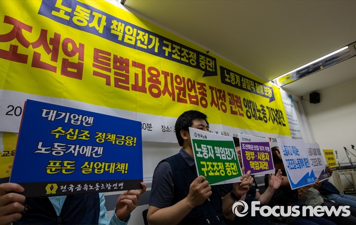 (서울=포커스뉴스) 30일 오전 서울 중구 프레스센터에서 열린 조선업 특별고용지원업종 지정 관련 양대노총 기자회견에 참석한 관계자들이 일방적 구조조정을 반대하는 손팻말을 들고 있다.