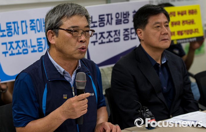 (서울=포커스뉴스) 30일 오전 서울 중구 프레스센터에서 열린 조선업 특별고용지원업종 지정 관련 양대노총 기자회견에 참석한 김종인 민주노총 부위원장이 발언하고 있다.