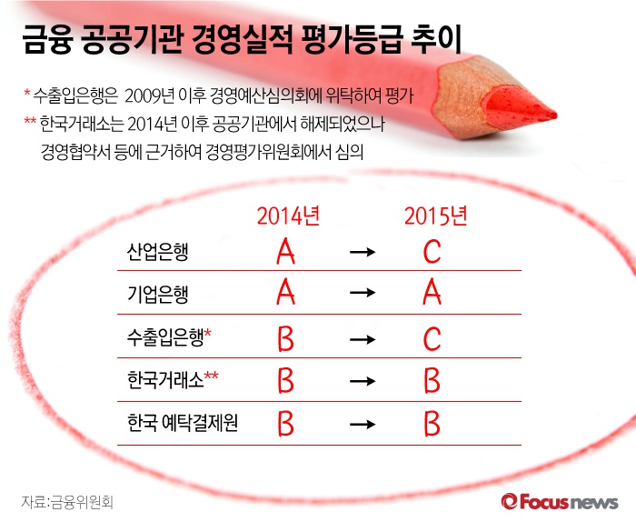 (서울=포커스뉴스) 30일 금융위원회 발표에 따르면 2015년 5개 금융 공공기관 경영실적 평가에서 기업은행은 A등급, 한국거래소와 한국예탁결제원은 B등급, 산업은행과 수출입은행은 최하 등급인 C등급을 맞았다.
