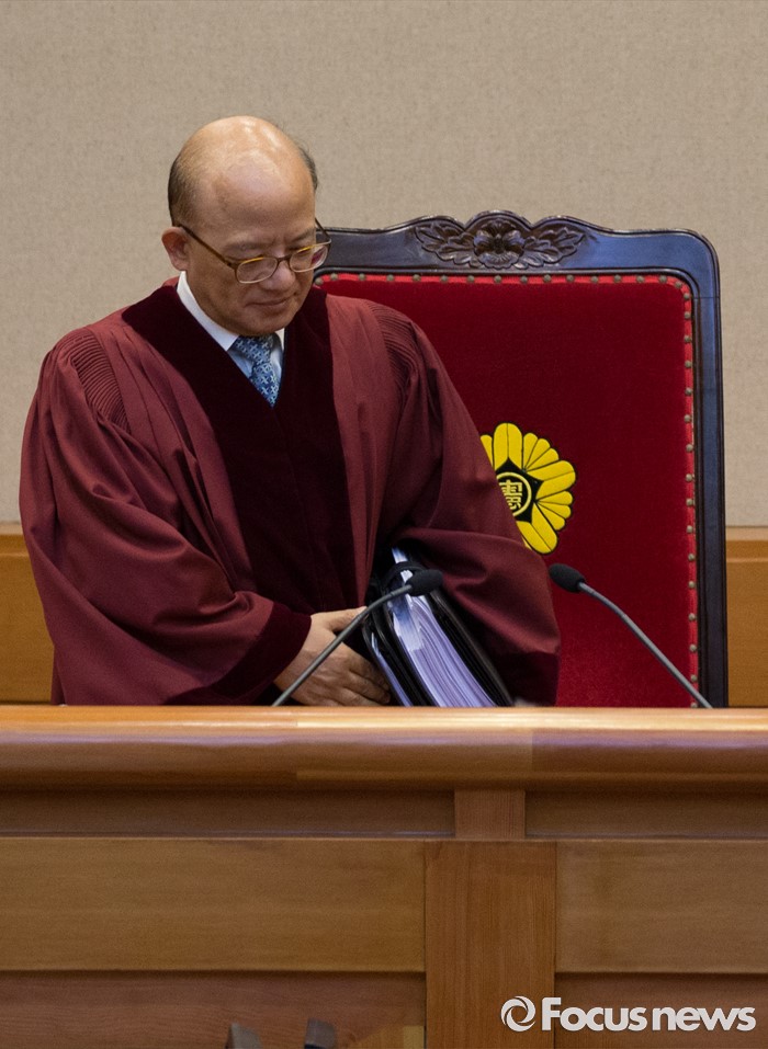 (서울=포커스뉴스) 30일 오후 서울 종로구 헌법재판소 대심판정에서 박한철 헌법재판소장이 '언론인 선거운동 금지' 공직선거법 제1항 제5호 위헌법률심판 사건 선고를 위해 입장하고 있다.