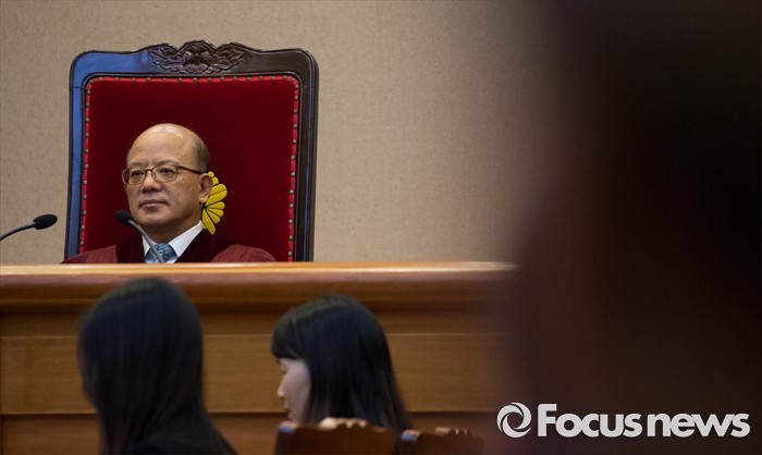 (서울=포커스뉴스) 30일 오후 서울 종로구 헌법재판소 대심판정에서 박한철 헌법재판소장이 '언론인 선거운동 금지' 공직선거법 제1항 제5호 위헌법률심판 사건 선고를 위해 착석해 있다.
