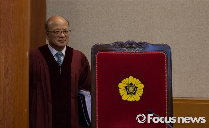 (서울=포커스뉴스) 30일 오후 서울 종로구 헌법재판소 대심판정에서 박한철 헌법재판소장이 '언론인 선거운동 금지' 공직선거법 제1항 제5호 위헌법률심판 사건 선고를 위해 입장하고 있다.