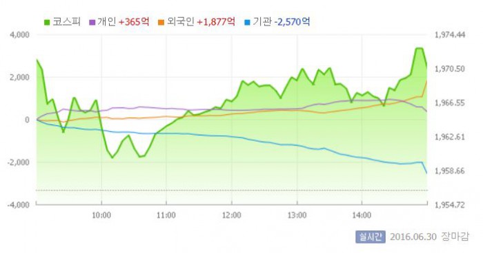 (서울=포커스뉴스) 코스피가 브렉시트(영국의 유럽연합 탈퇴) 충격이 누그러진 영향으로 1970선을 회복했다.
