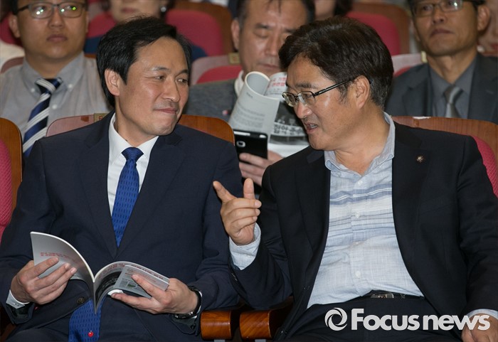 (서울=포커스뉴스) 30일 오후 서울 여의도 국회 의원회관에서 열린 전국가맹점주 피해사례 발표 및 관련법 개정촉구 대회에 참석한 우상호(왼쪽) 더불어민주당 원내대표와 우원식 을지로위원장이 대화하고 있다.