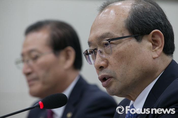 (서울=포커스뉴스) 30일 오후 서울 여의도 국회에서 열린 국방위원회 전체회의에 참석한 장명진 방위사업청장이 의원들의 질의에 답하고 있다. 왼쪽은 박창명 병무청장.