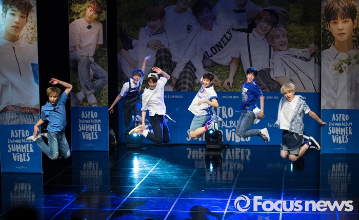 (서울=포커스뉴스) 30일 오후 서울 강남구 일지아트홀에서 열린 아이돌 그룹 아스트로의 두번째 미니앨범 'Summer Vibes' 발표 쇼케이스에 참여한 멤버들이 신곡무대를 선보이고 있다.