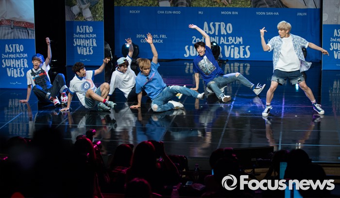 (서울=포커스뉴스) 30일 오후 서울 강남구 일지아트홀에서 열린 아이돌 그룹 아스트로의 두번째 미니앨범 'Summer Vibes' 발표 쇼케이스에 참여한 멤버들이 신곡무대를 선보이고 있다.