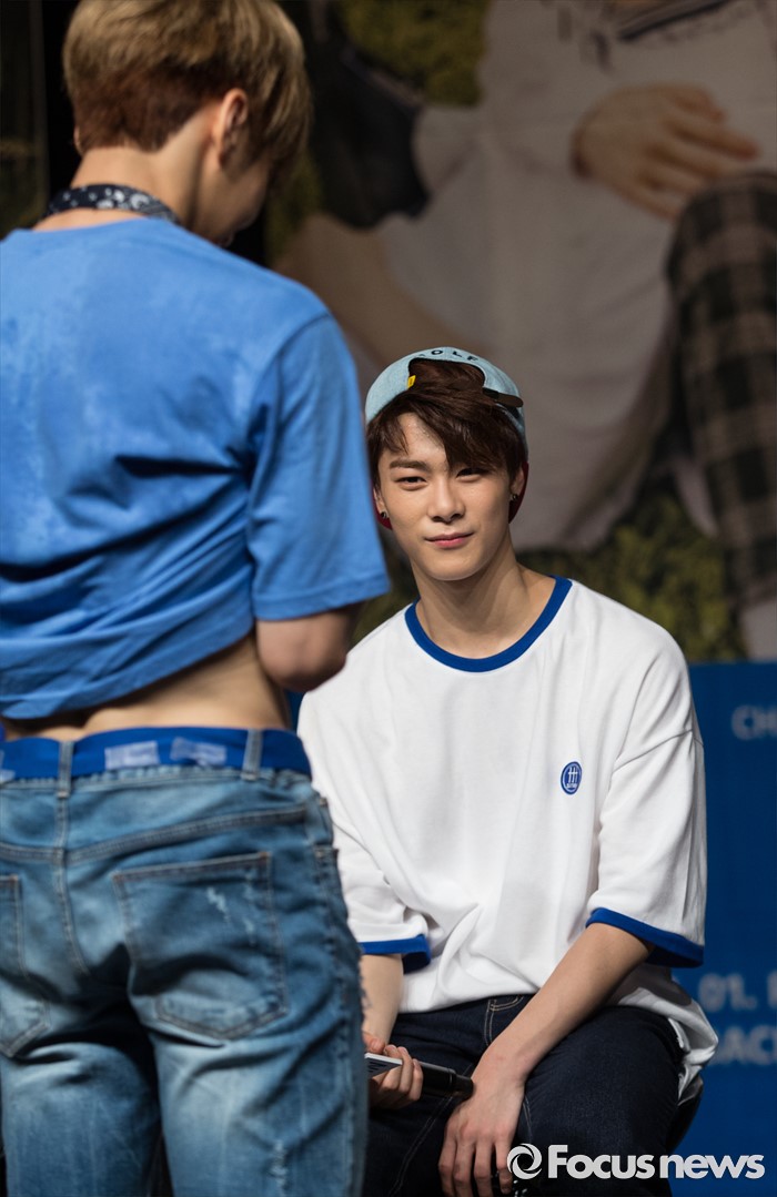 (서울=포커스뉴스) 30일 오후 서울 강남구 일지아트홀에서 열린 아이돌 그룹 아스트로의 두번째 미니앨범 'Summer Vibes' 발표 쇼케이스에 참여한 멤버 문빈(오른쪽)이 진진의 복근을 확인하고 있다.