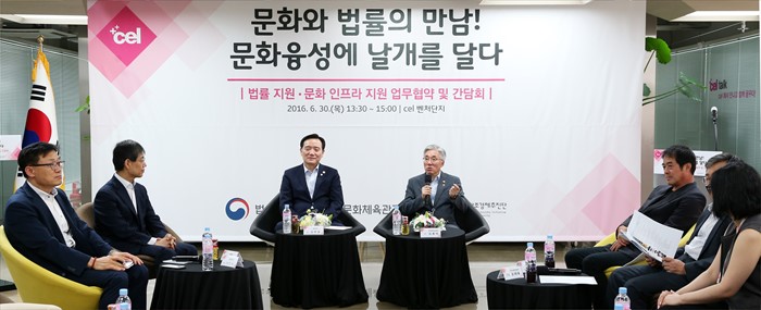 (서울=포커스뉴스) 김종덕 문체육관광부 장관이 30일 서울 중구 문화창조벤처단지에서 문체부와 법무부 간 ‘문화융성을 위한 법률 지원, 문화 인프라 지원'에 관한 업무협약(MOU) 체결을 마치고 문화창조벤처단지 입주기업 간담회를 하고 있다. <사진제공=문화체육관광부>