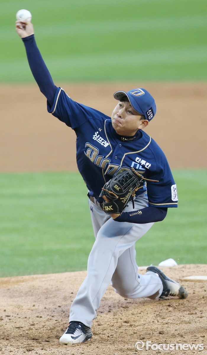 (서울=포커스뉴스) 30일 서울 잠실구장에서 열린 2016 프로야구 NC-두산 경기에서 1회말 NC 선발투수 임서준이 투구하고 있다.