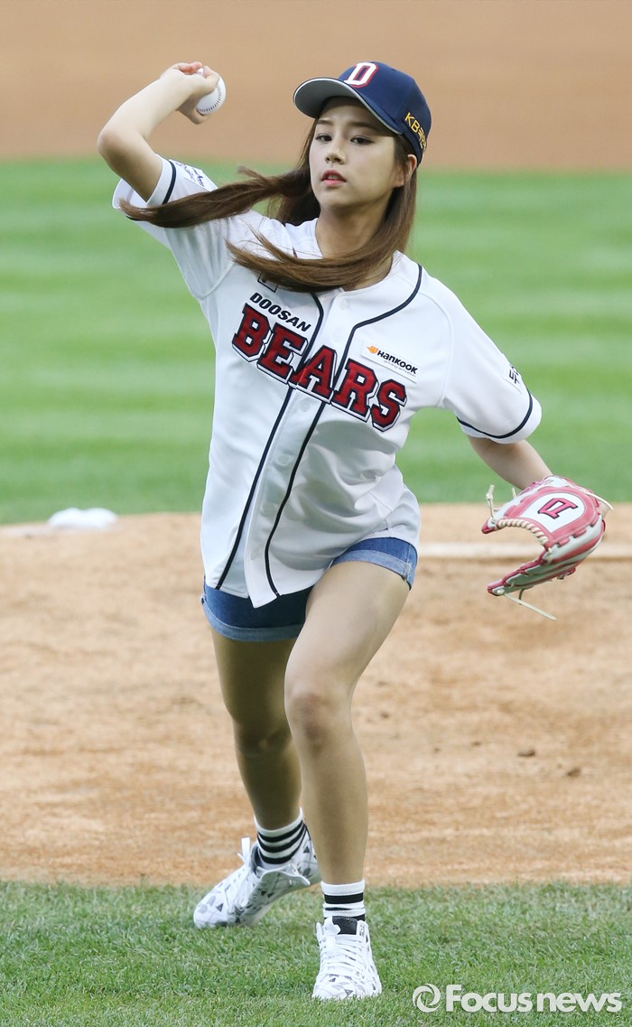 (서울=포커스뉴스) 30일 서울 잠실구장에서 열린 2016 프로야구 NC-두산 경기에 앞서 걸그룹 '라붐'의 솔빈이 시구하고 있다.