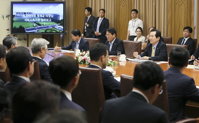 (서울=포커스뉴스) 정세균 국회의장이 30일 오후 서울 여의도 국회 접견실에서 국회사무처, 도서관, 예산정책처, 입법조사처로부터 취임 후 첫 공식 업무보고를 받고 있다. <사진제공=국회>