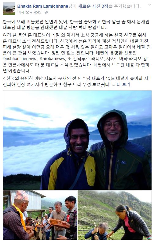 (서울=포커스뉴스) 문재인 더불어민주당 전 대표와 네팔에서 동행했던 네팔인 벅터 람이 자신의 SNS에 직접 쓴 한글 문장과 함께 문 전 대표의 사진을 지난 29일 공개했다. <사진제공=벅터 람(Bhakta Ram Lamichhane) 페이스북>