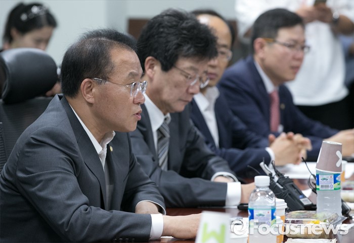 (서울=포커스뉴스) 1일 오전 서울 여의도 국회 의원회관에서 영남권 신공항 백지화 및 대구 공군비행장 이전과 존치문제 등 논의를 위해 열린 새누리당 대구지역 의원들과의 간담회에 참석한 윤재옥 대구시장 위원장이 모두발언을 하고 있다.